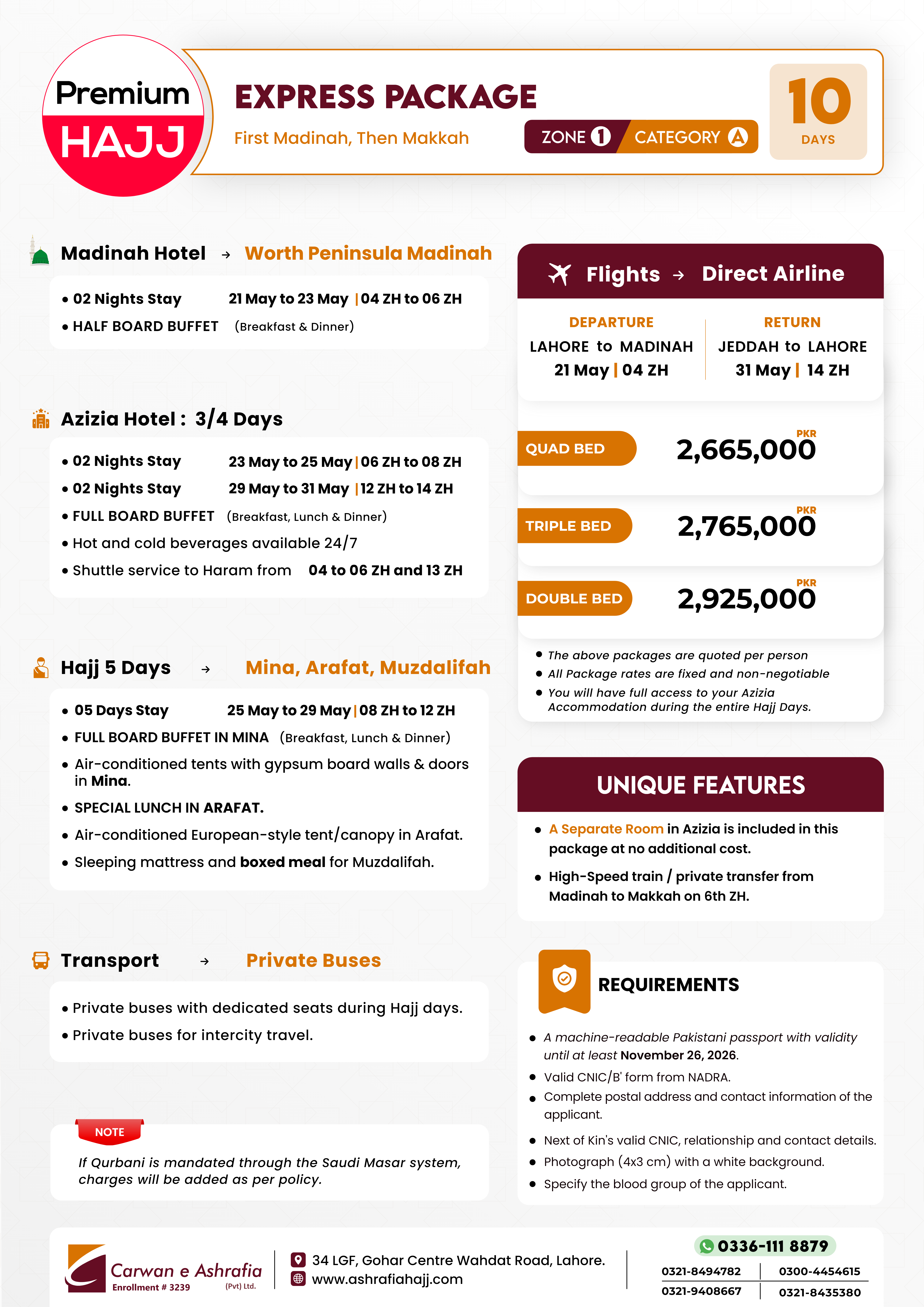 - 10-day express Hajj package starting in Madinah and ending in Makkah.