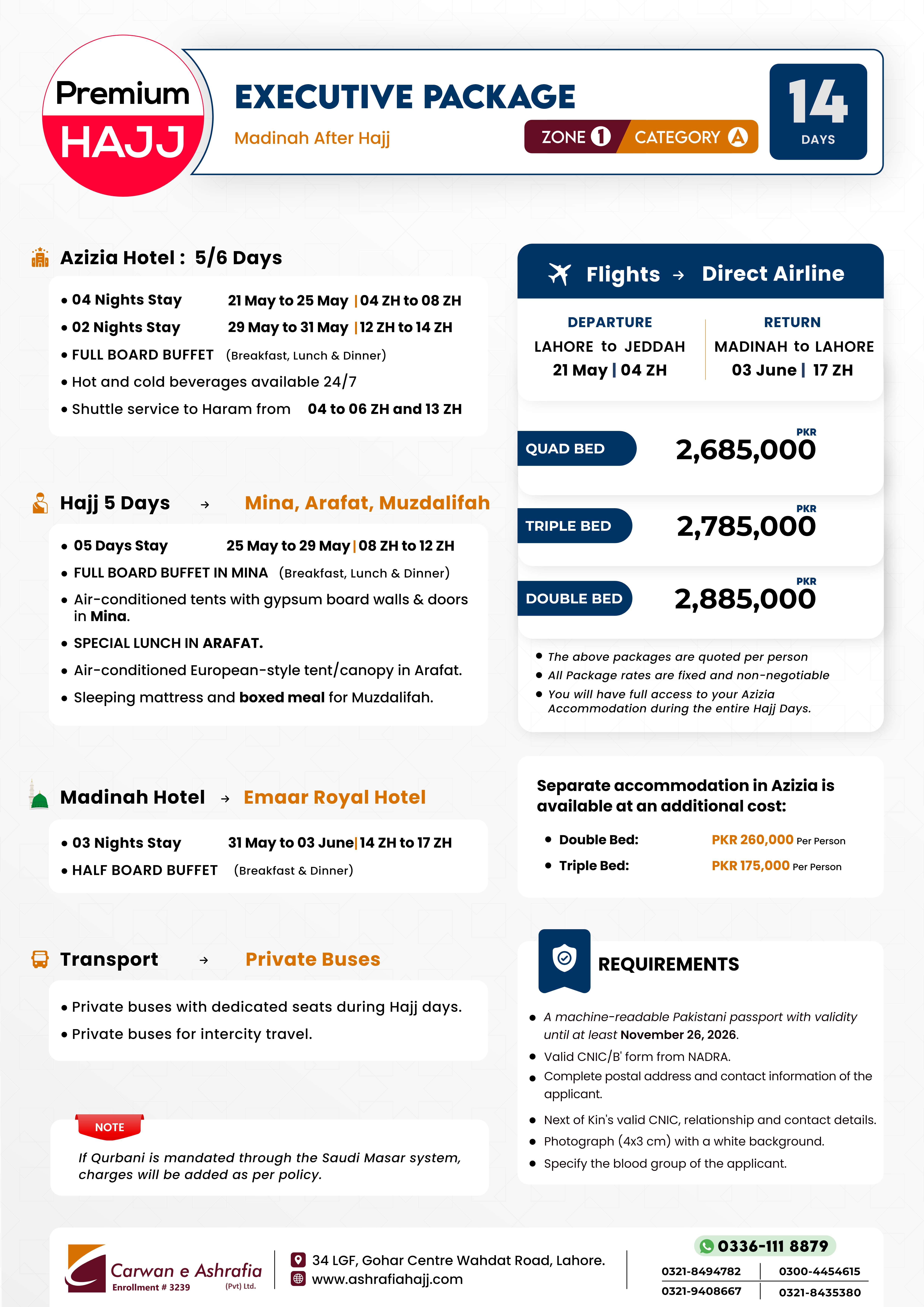 - 14-day executive Hajj package with Madinah stay after Hajj.