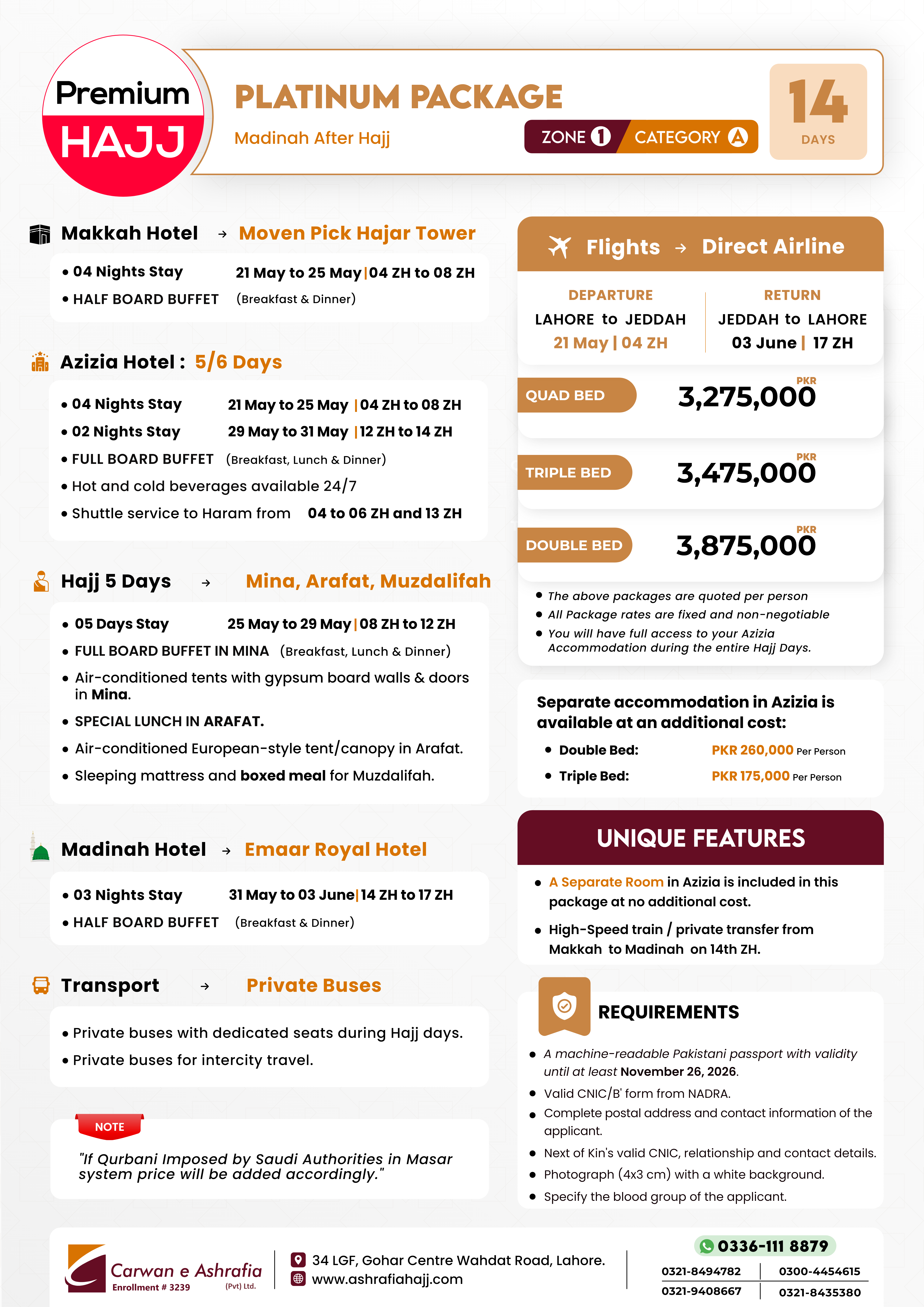 - 14-day Platinum Hajj Package with Madinah stay after Hajj.