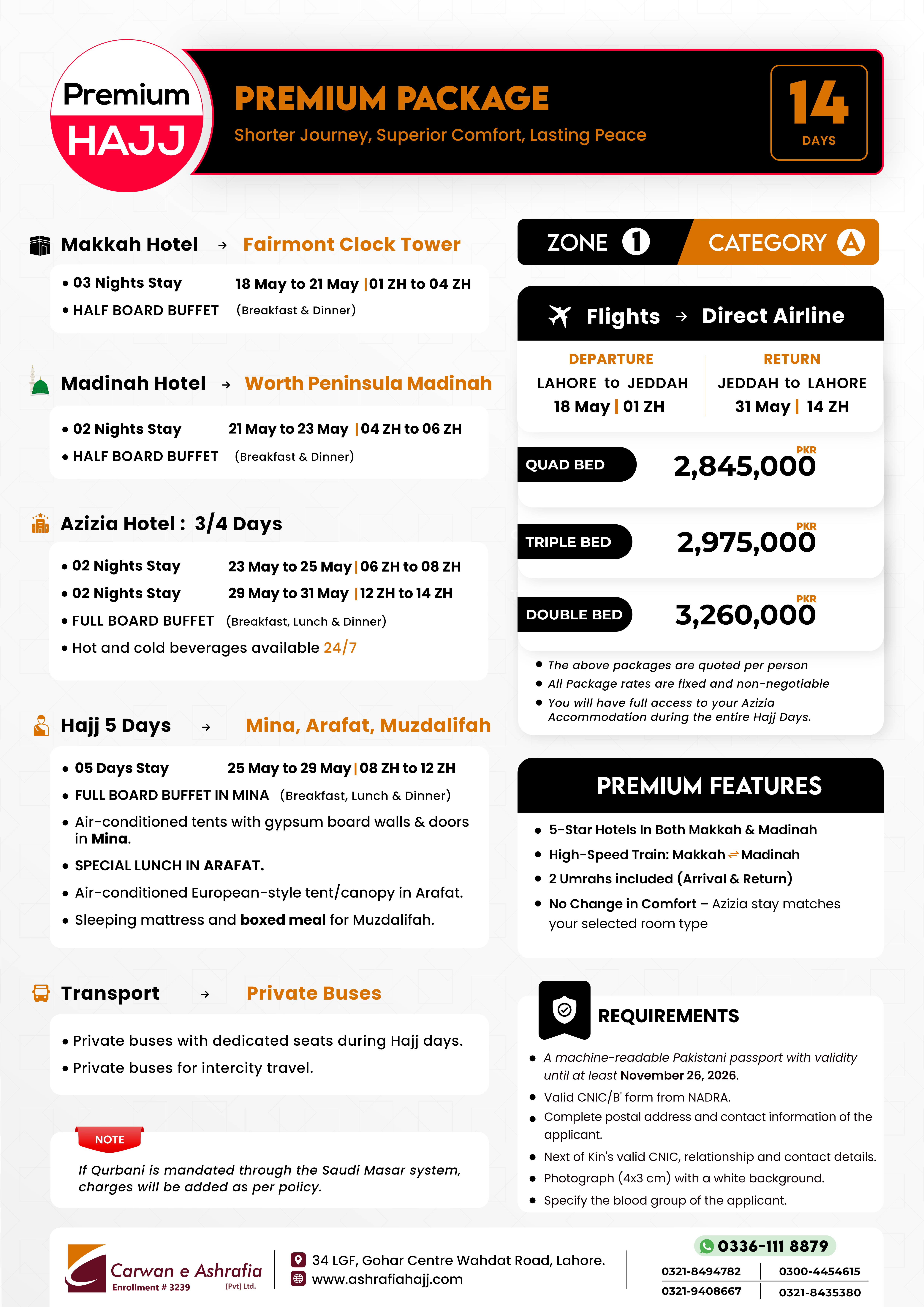 Every detail has been carefully curated to provide an unparalleled Hajj experience, combining devotion, luxury, and exceptional service. Reserve your spot today and embark on a spiritually fulfilling pilgrimage with the highest level of comfort and convenience.